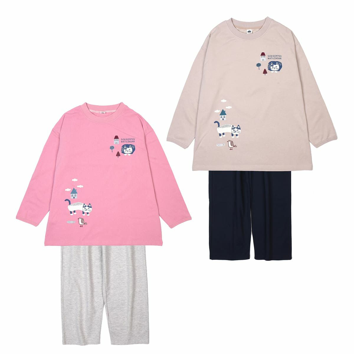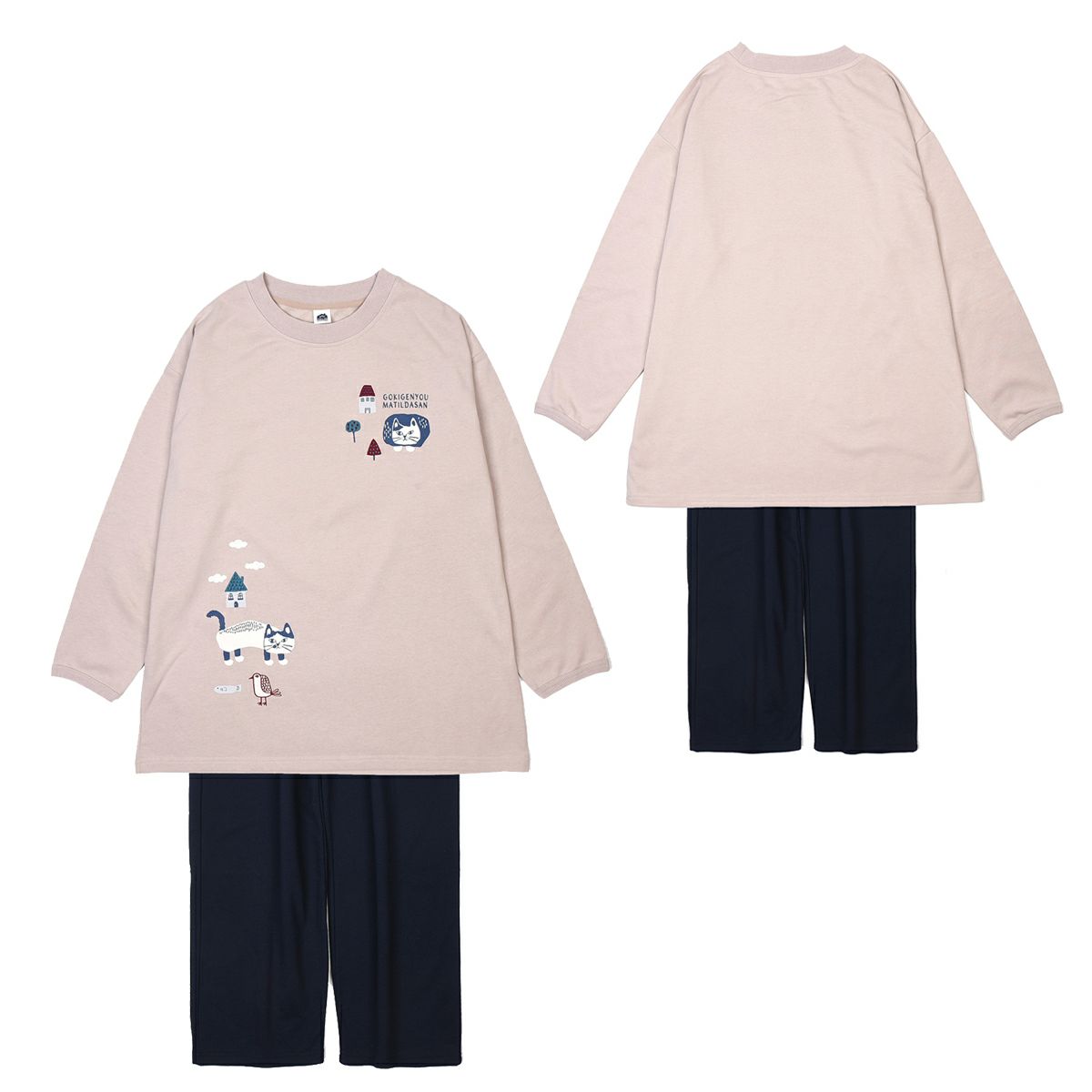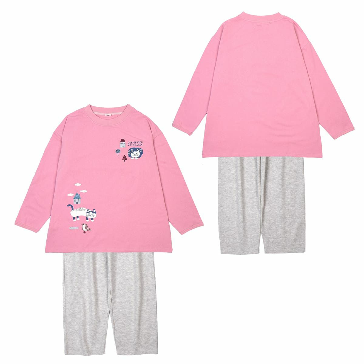 ルームウエア レディース 長袖 上下セット プルオーバールームウエア ネコまるけ柄 24-7568 クスグルジャパン ミニミニ裏毛ニット 上下セット