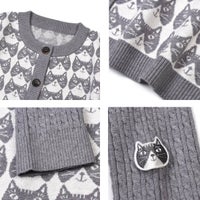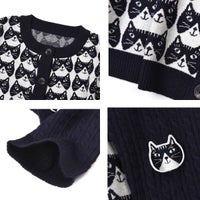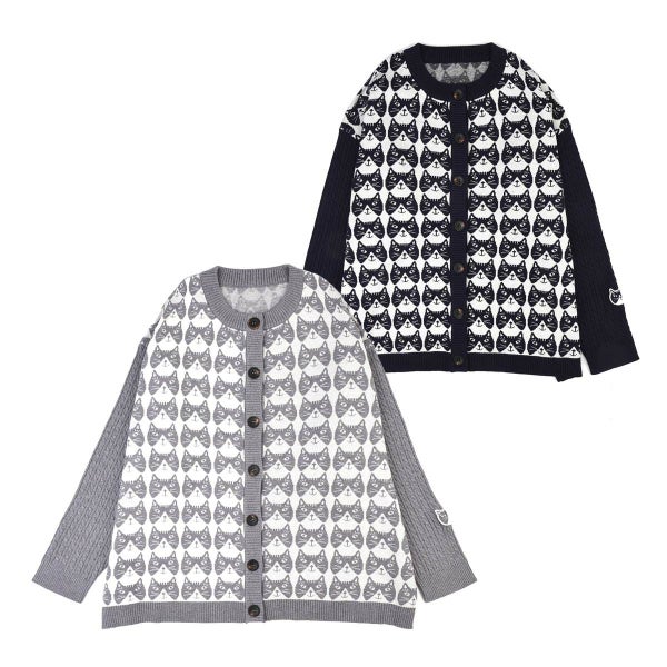 ミチョロの総柄が入ったゆったりカーディガン。裾や首元のリブ切り替えがアクセント。お袖は縄編みベースでミチョロのワッペン付き。