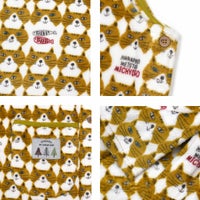 特 徴 :脱ぎ着がしやすい脇あきエプロンです。ミチョロ柄は、ミチョロの顔が総柄プリントされたエプロンです。脇:釦あきです。