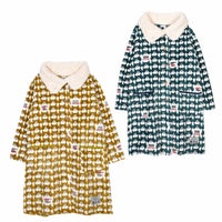 特 徴 :膝下まであたたかい前あきワンピース。ゆったりした着心地で、襟のボタンをとめるとタートルになり、首元まであたためてくれます。前:釦あき。