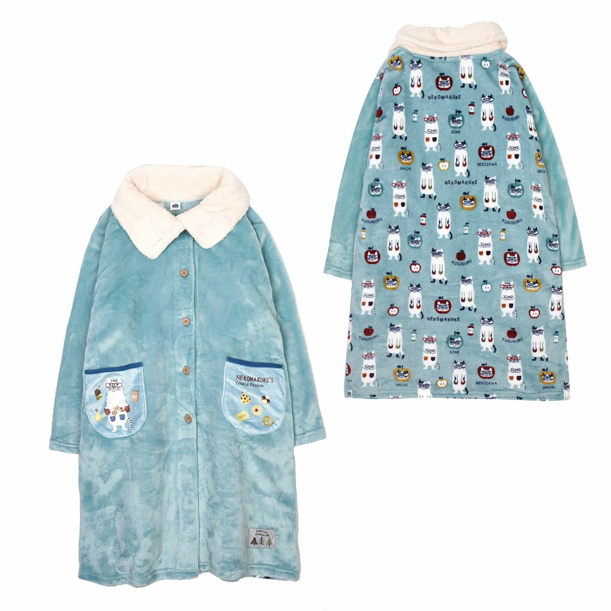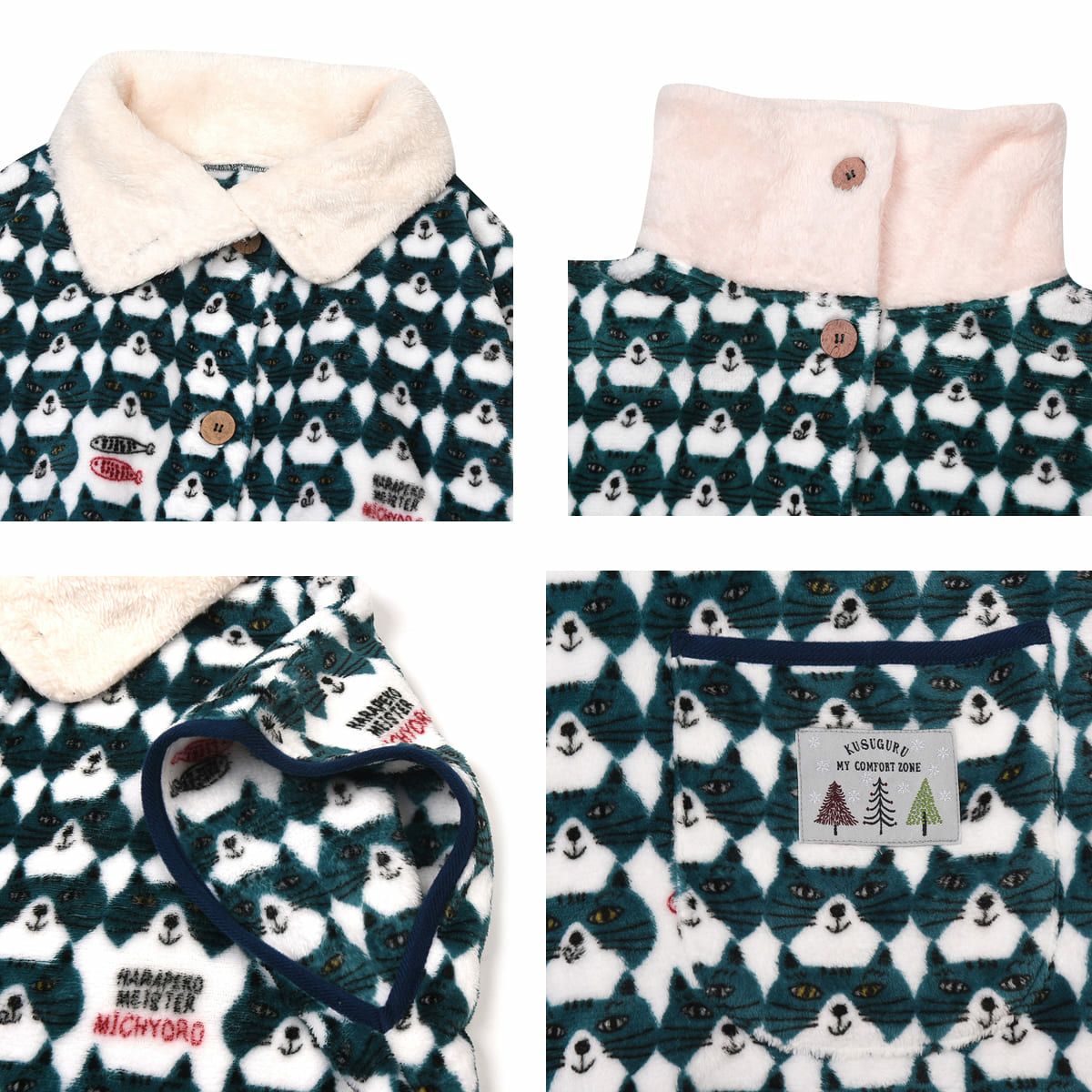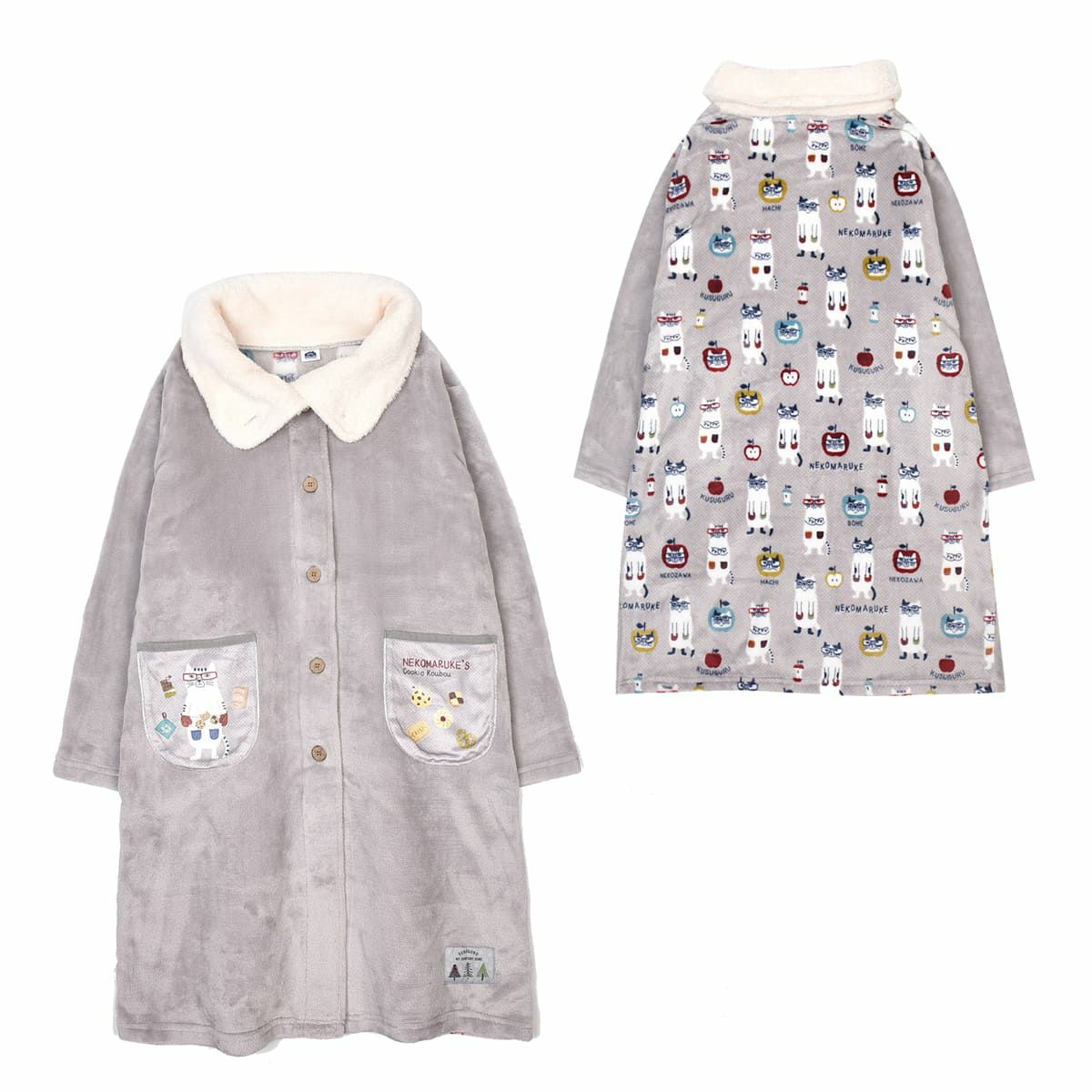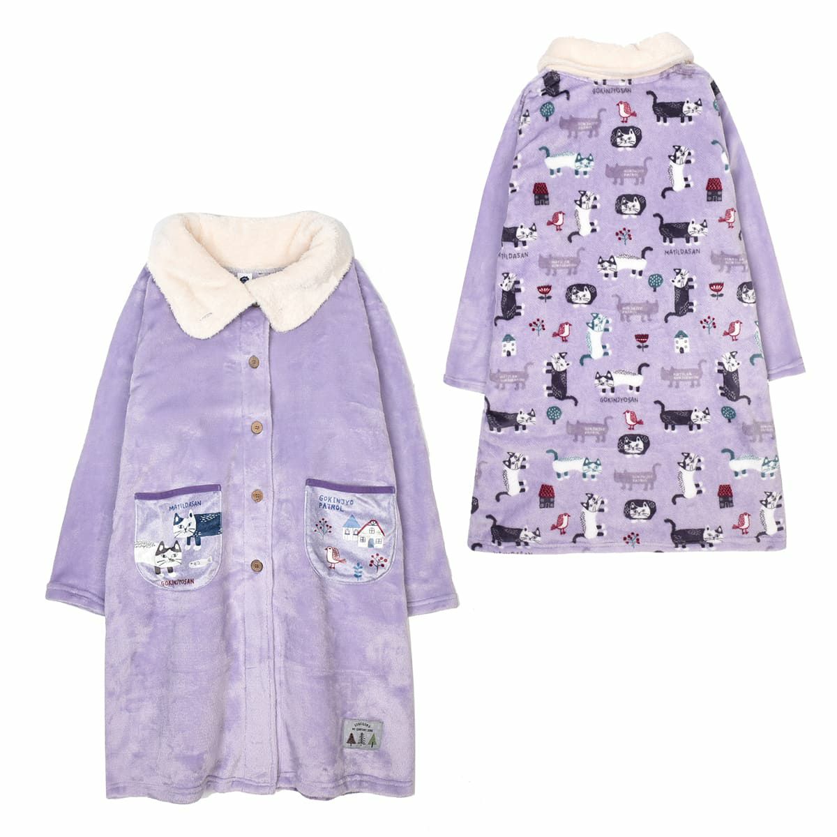 ルームウエア レディース フリーサイズ おしゃれ ふわふわ あたたかい モケモケット 前あきワンピース ネコまるけ柄 24-7641 クスグルジャパン