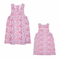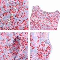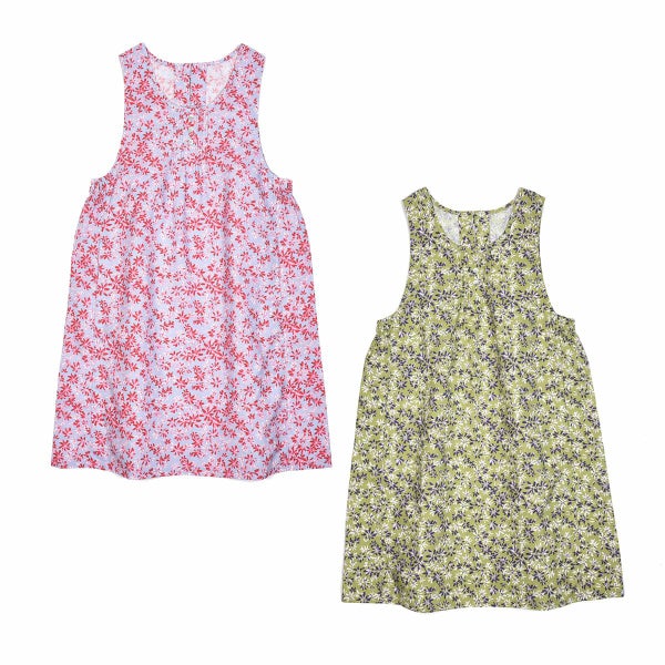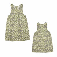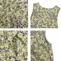鮮やかな花柄プリントのドレスタイプのエプロン。どちらも着丈が長くプルオーバータイプなのでワンピース感覚で着れます。