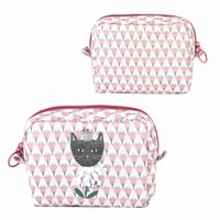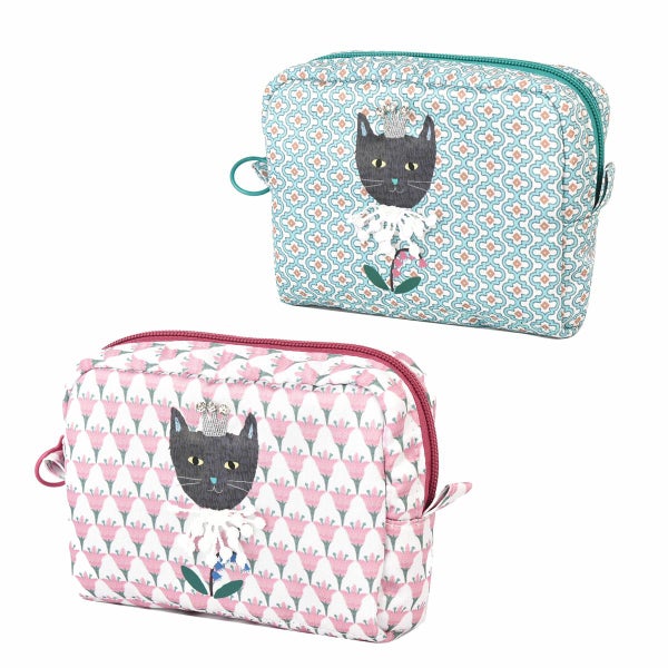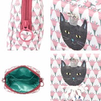 光沢のあるやわらかな手触りの良いサテン生地に、少しだけレトロ感ただよう砂糖菓子色のプリント模様。ラインストーンを縫いこんだキラキラな冠をかぶった黒猫の「みつまめプリンセス」がキュートで魅力的です。内側はどれもはっとするエメラルドグリーンの裏生地づかいにご注目。