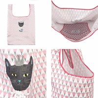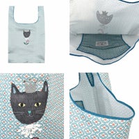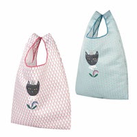 光沢のあるやわらかな手触りの良いサテン生地に、少しだけレトロ感ただよう砂糖菓子色のプリント模様。ラインストーンを縫いこんだキラキラな冠をかぶった黒猫の「みつまめプリンセス」がキュートで魅力的です。内側はどれもはっとするエメラルドグリーンの裏生地づかいにご注目。