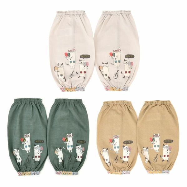 特 徴 :楽しそうなネコまるけ達のプリント図案。袖口のパッチワーク風の配色がアクセント。