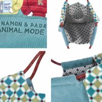 パウロとシナモンのあたたかなアップリケ。フリース生地はカラフルな幾何学模様のモザイクプリントとのコラボ。