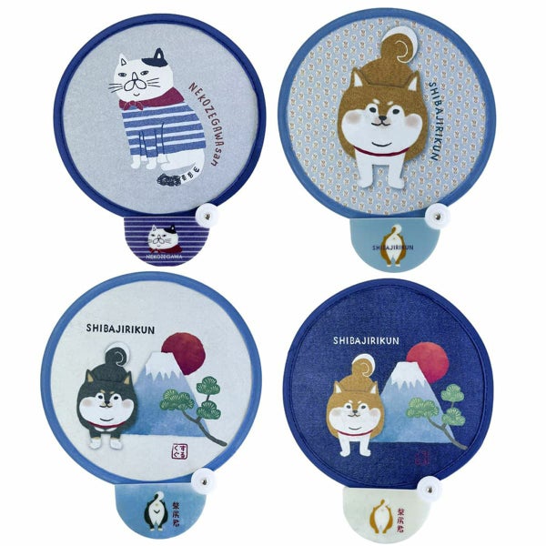 コメント:ねこぜがわさん柄と柴尻君柄のくるくるうちわ。パンッ!って広げて8の字にくるりんとねじって畳んでね♪