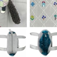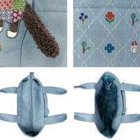 コメント:クスグルの人気商品ハミポケバッグ。アップリケのご近所さんはカラフルなパッチワークの装い。後ろ側は総柄プリントでイメージががらりと変わります。