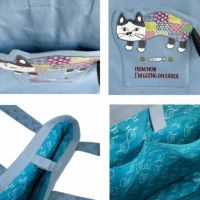 コメント:肩から掛けられる長めの持ち手はプリント配色使い。書類などもたっぷり入るサイズ。インパクトのあるダイカットポケットはカラフルなパッチワークの装い。