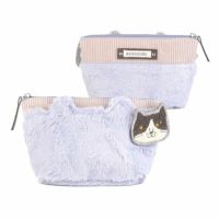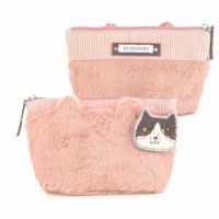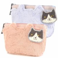フェイクファー素材の猫耳ポーチです。パウダーカラーの色あいで少し大人女子気分。