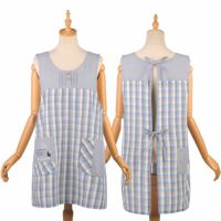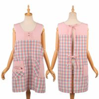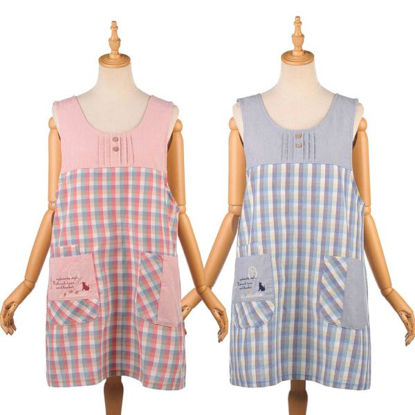 胸のピンタックがポイントのエプロン。優しいネコ柄の刺繍とチェック柄の明るさがベストマッチです。後:リボンあき。