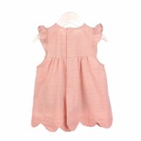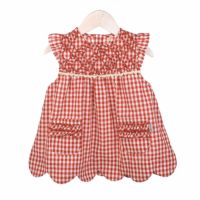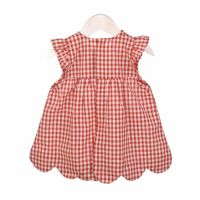 襟付きのチェックス柄エプロンです。フロントにポケットが付き、裾がスカラップになっていてかわいいですね。後:マジックテープあき。