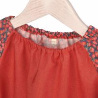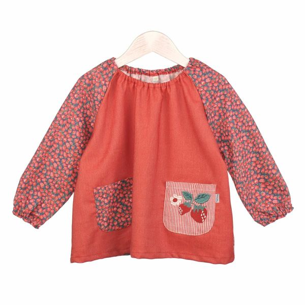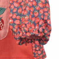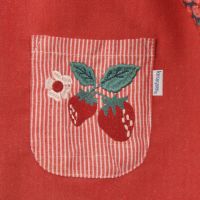 衿口ゴムで、ゆったりサイズのスモックです。フロントにポケットが付いていてそこにイチゴの刺しゅうがついてかわいいですね。