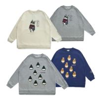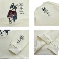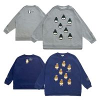ミニ裏毛素材のゆったりシルエット。袖口はあえてあまり絞らず、特に裾のリブには程よいゆとりがあるのでヒップ周りを拾わないデザイン。着丈に前後差をつけたヘムラインと控えめなスリット。クスグルキャラクターたちの手の込んだ刺繍やプリント。片袖口のワンポイントの刺繍にも注目。クスグルならではの遊び心がある仕上がりです。