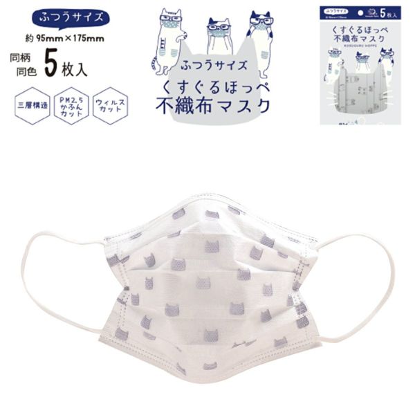 不織布マスク ふつうサイズ ねこたま柄 21-2205 #2/BL クスグルジャパン 21年vol.3 ふつうサイズ 柄入り 息らく 通気性 優良 三層構造 5枚入り