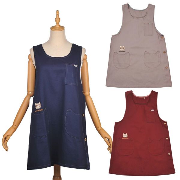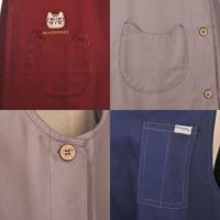 特 徴 :胸には、ペン差しのポケットが付いています。ネコ型のポケットはワークエプロンのイメージを和らげてくれます。ここ注目!後ろポケットは左右の色を変えています。
