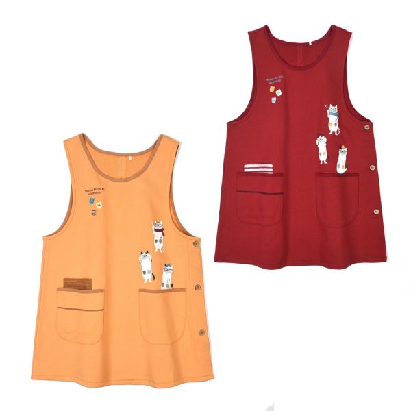 特 徴 :脱ぎ着が楽な脇あきエプロンです。イエローとアカの色が元気なイメージ。