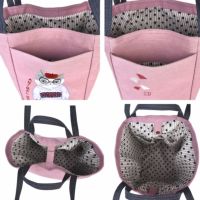 特 徴 :脇のポケットにシナモンの大きなアップリケがついた、マチ幅がたっぷり広めのコロンとしたバッグ。肩からかけることのできる長めの持ち手と、手さげができる小さな持ち手がついています。バッグ口/マグネット釦あき。