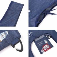 まるで織物のようなイメージのエコバッグたち。ポリエステル生地にプリントで先染めを表現しました。持ち手部分が幅広なので、荷物をたくさん入れても手への負担が少ないです。バッグ等に吊り下げられて携帯に便利なカラビナが付いています。マチを広げた状態で約20cm。内ポケット(タテ約12.5cm ヨコ約13cm)に折り畳んで収納できます。