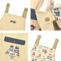 特 徴 :両脇がタブの釦あきになった脱ぎ着が楽なエプロン。脇のタブには釦が2つ付いているので身幅調節ができます。後ろ身頃は総柄プリント使いでイメージがガラリと変わります。