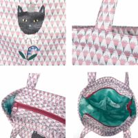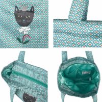 光沢のあるやわらかな手触りの良いサテン生地に、少しだけレトロ感ただよう砂糖菓子色のプリント模様。ラインストーンを縫いこんだキラキラな冠をかぶった黒猫の「みつまめプリンセス」がキュートで魅力的です。内側はどれもはっとするエメラルドグリーンの裏生地づかいにご注目。