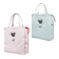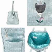 光沢のあるやわらかな手触りの良いサテン生地に、少しだけレトロ感ただよう砂糖菓子色のプリント模様。ラインストーンを縫いこんだキラキラな冠をかぶった黒猫の「みつまめプリンセス」がキュートで魅力的です。内側はどれもはっとするエメラルドグリーンの裏生地づかいにご注目。