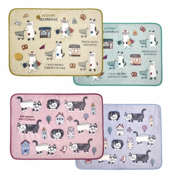 特 徴 :ネコまるけ、マチルダさんの総柄プリントとチェック、ドット柄の組み合わせ。柔らかなパステルカラーです。