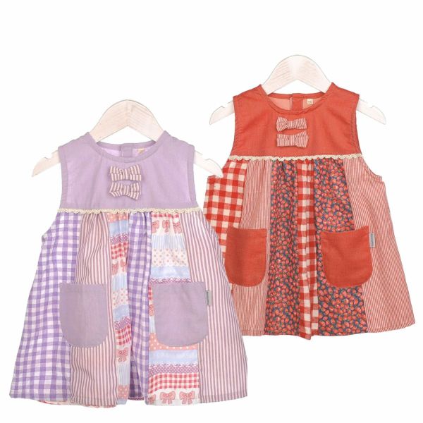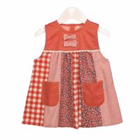 チェック柄、ストライプ柄にプリント柄がパッチワークされたエプロンです。フロントにポケットが付き、胸についたリボンのモチーフがかわいいですね。後:マジックテープ付き。
