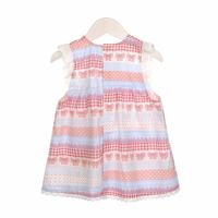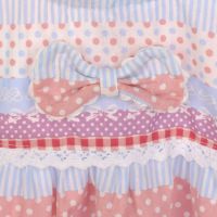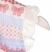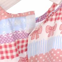 ストライプ柄、ドット柄、チェック柄、リボン柄などのパッチワークエプロンです。フロントにポケットが付き、裾、肩にレースが付いていてかわいいですね。後:マジックテープあき。