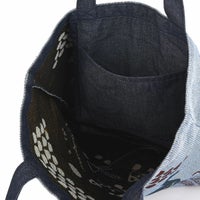 たっぷり入る大き目のトートバッグなので、お稽古事の道具や、お着替えを入れたりにもおすすめです。持ち手はデニム調の生地を使用した配色使いで、肩から掛けられる長さ。内ポケットも付いています。