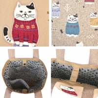 特 徴 :お馴染みのトートバッグです。前側に大きなねこぜがわさんのアップリケがついていて、後ろ側のプリントはにぎやかです。バッグ口/マグネット釦あき。