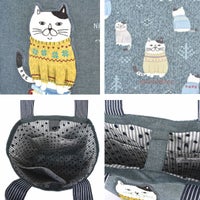 プリント生地はセーターのメリヤス編みの模様をイメージ。寒がりなねこぜがわさんには、あたたかなセーターを着せてあげました。プリント生地のベースはあたたかなニットの編み目のような模様が入っています。