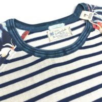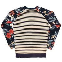 肌触りの良いピュアコットン素材を使用。トロピカルとボーダー柄のマッチしたデザインは年中着まわしたくなる1枚。カラーパンツやサーフスタイルにぴったりな質感とデザインです。