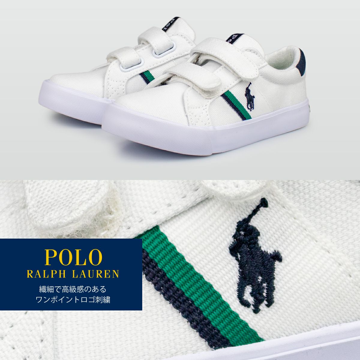 他の画像を見る 上品で高級感のあるシンプルスニーカーです。 ポロラルフローレン Polo by Ralph Lauren キッズ スニーカー GAFFNEY EZ ガフニーEZ ホワイト/グリーン 13-16cm SALE 通常販売価格 ¥ 5,390 のところ セール価格 ¥ 3,773 税込 カートに入れる お気に入りに登録する
