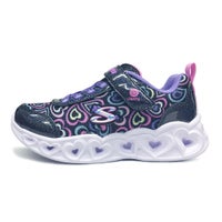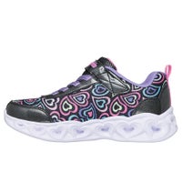 コメント:楽しいきらめきを放つ、スケッチャーズ ハート ライツ - ブギー ラブ。キラキラ輝くハートプリントの合成素材のアッパー、固定式ストレッチレースとアダプティブクロージャー、さらにハートがきらめく3Dスカルプテッドライトアップミッドソールが特長のカラフルなスニーカー。