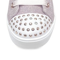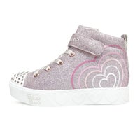 コメント:きらびやかな動きで部屋を明るく照らしていく Skechers Twinkle Toes(スケッチャーズ トゥインクルトーズ):ハート ステップス - ハート グロウ。ハート型モチーフが光るデザイン、ストレッチレースをほどこした光沢のある合成素材のアッパー、調整可能なインステップストラップ、パッド入りの履き口を採用したハイトップシルエット、光るラインストーンの装飾をあしらったキャップトゥが特長です。